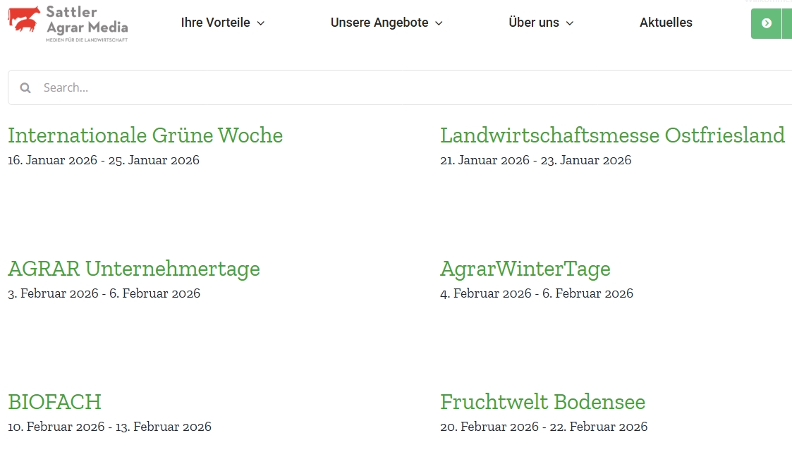 Diesen Service pflegen wir von Sattler Agrar Media Jahr für Jahr – und das kommt gut an, wie unsere Statistiken zeigen. Deshalb freuen wir uns schon jetzt über viele Besuche und Ihr Interesse. Für Ihre Anregungen stehen wir gerne zur Verfügung und sind selbst bei vielen Veranstaltungen vor Ort. https://www.sattler.media/